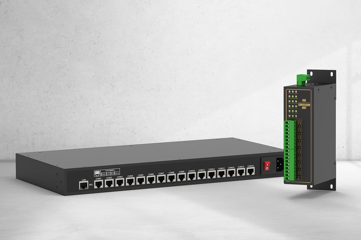 NCOM7E3S 是一款双电源高性能串口服务器,提供2路以太网口并支持交换机功能,16路复合串口,除具备常规串口服务器透明传输功能外,还具备 Modbus 网关的功能,将 Modbus TCP与 Modbus RTU/ModbuS ASCIl 协议之间进行转换,使用户的 Modbus 串口设备能够立即具备 TCP/IP 网络接口功能,连接网络进行数据通信,极大的扩展串口设备的通信距离。