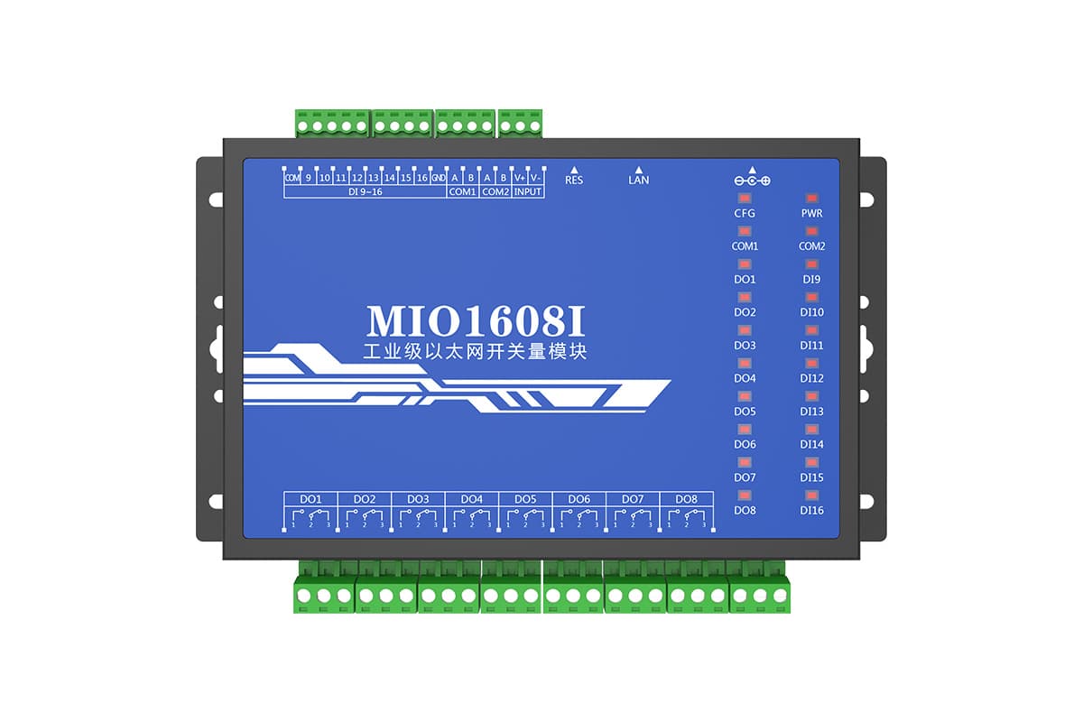 MIO1608I是我公司研发的开关量采集控制模块,提供8路继电器输出、8路DI采集通道,主要用来采集现场的I/O输入信号,输出I/O控制信号,同时还集合了串口服务器和Modbus网关的功能。